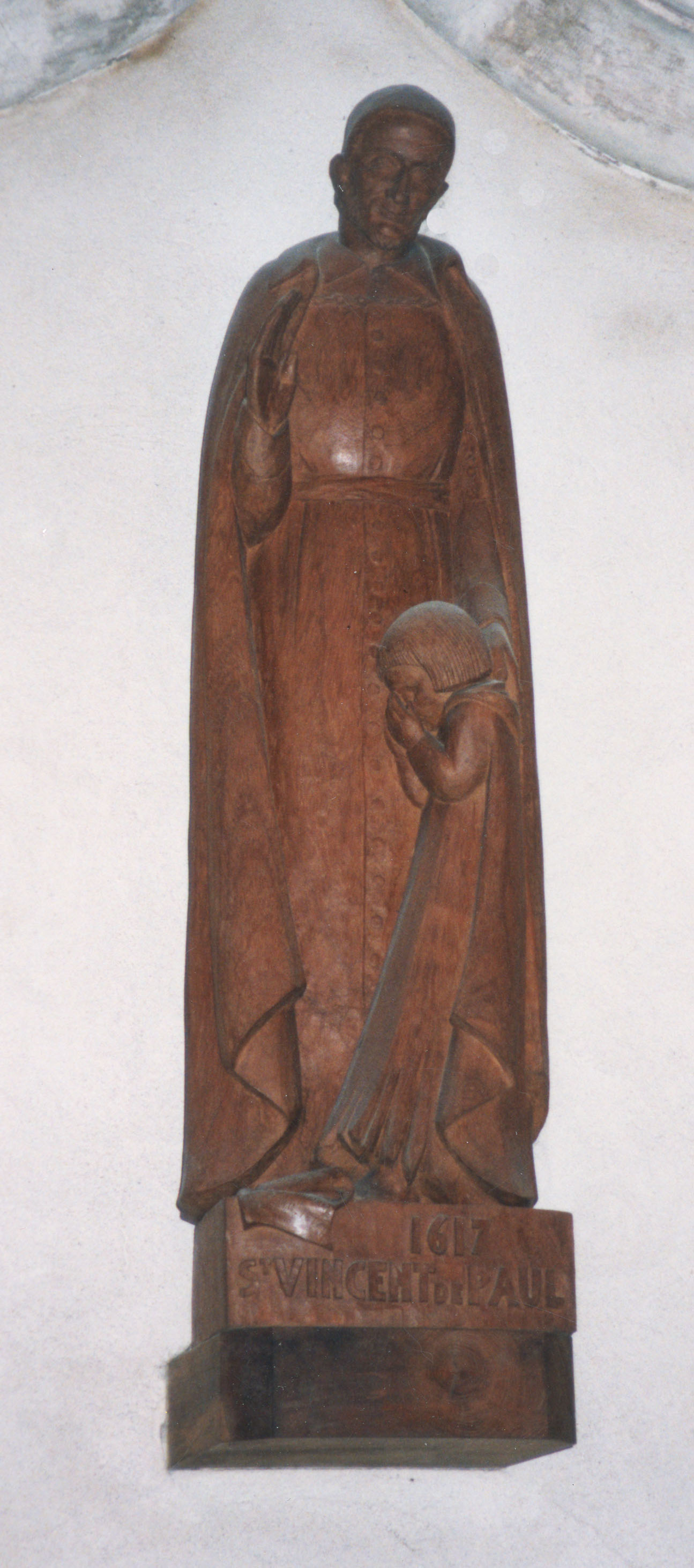 Carved wooden statue, Vincent de Paul, standing, cassock, cape, cincture, skullcap, blessing child; date 1617 of Vincent's pastorate; original in parish church, Chatillon sur Chalaronne