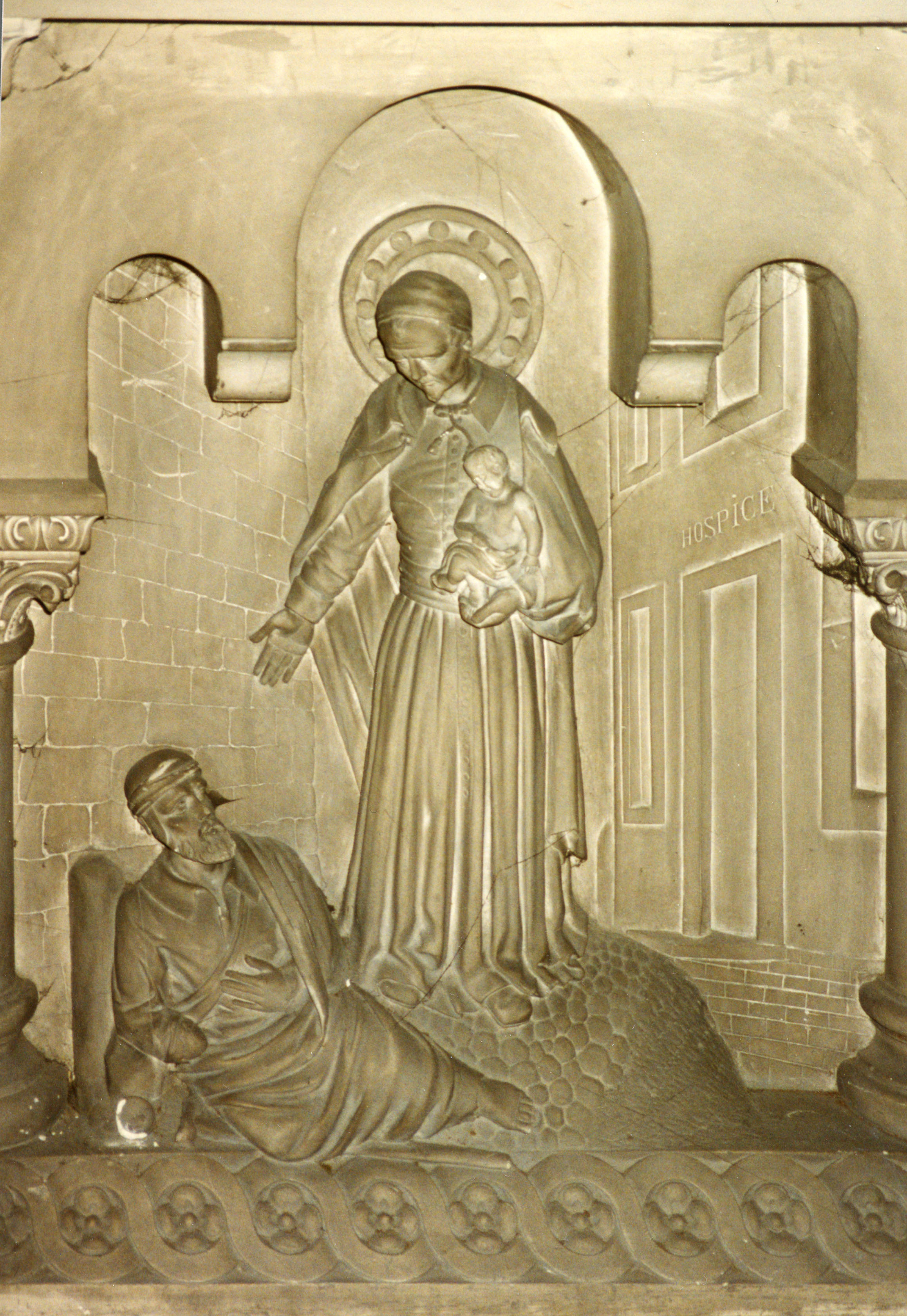 Carved altarpiece, Vincent de Paul, standing, cassock, cincture, cape, skullcap, halo, holding child, reading to handicapped man, standing before Hospice; original in St. Pierre, Macon