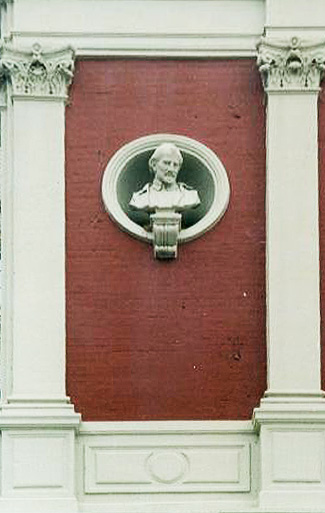 Stone bust, in circle on facade of former imperial palace; Vincent de Paul, cassock, mantle, skullcap; Biarritz