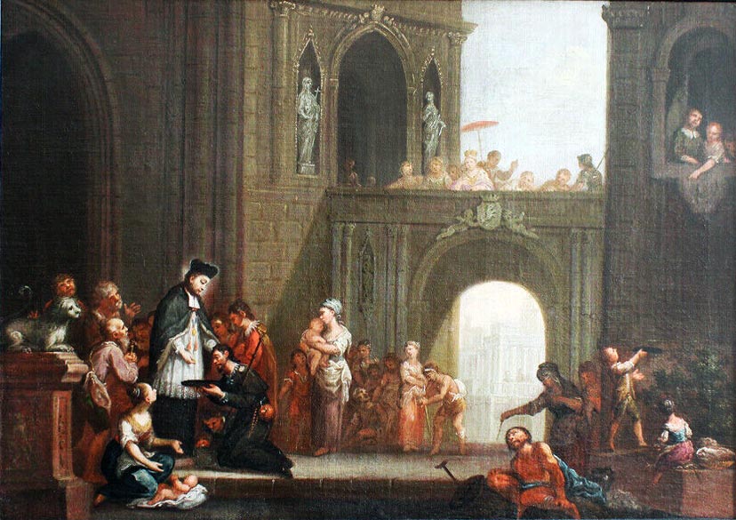 Queen Marguerite de Valois observes from arch, with crown, umbrella