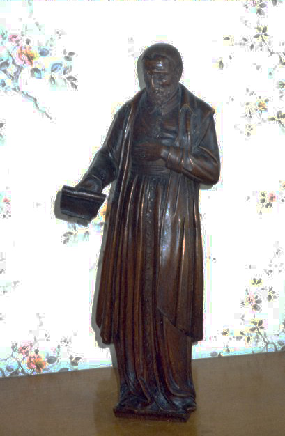 Carved wood; Vincent de Paul, standing, cassock, mantle, skullcap, holding scroll representing Common Rules; original in Ste Anne, Amiens