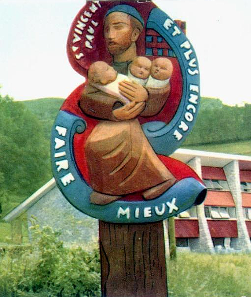 Painted wood; Vincent de Paul with three children; text: To do better and more besides; original at Cité de Secours, Lourdes