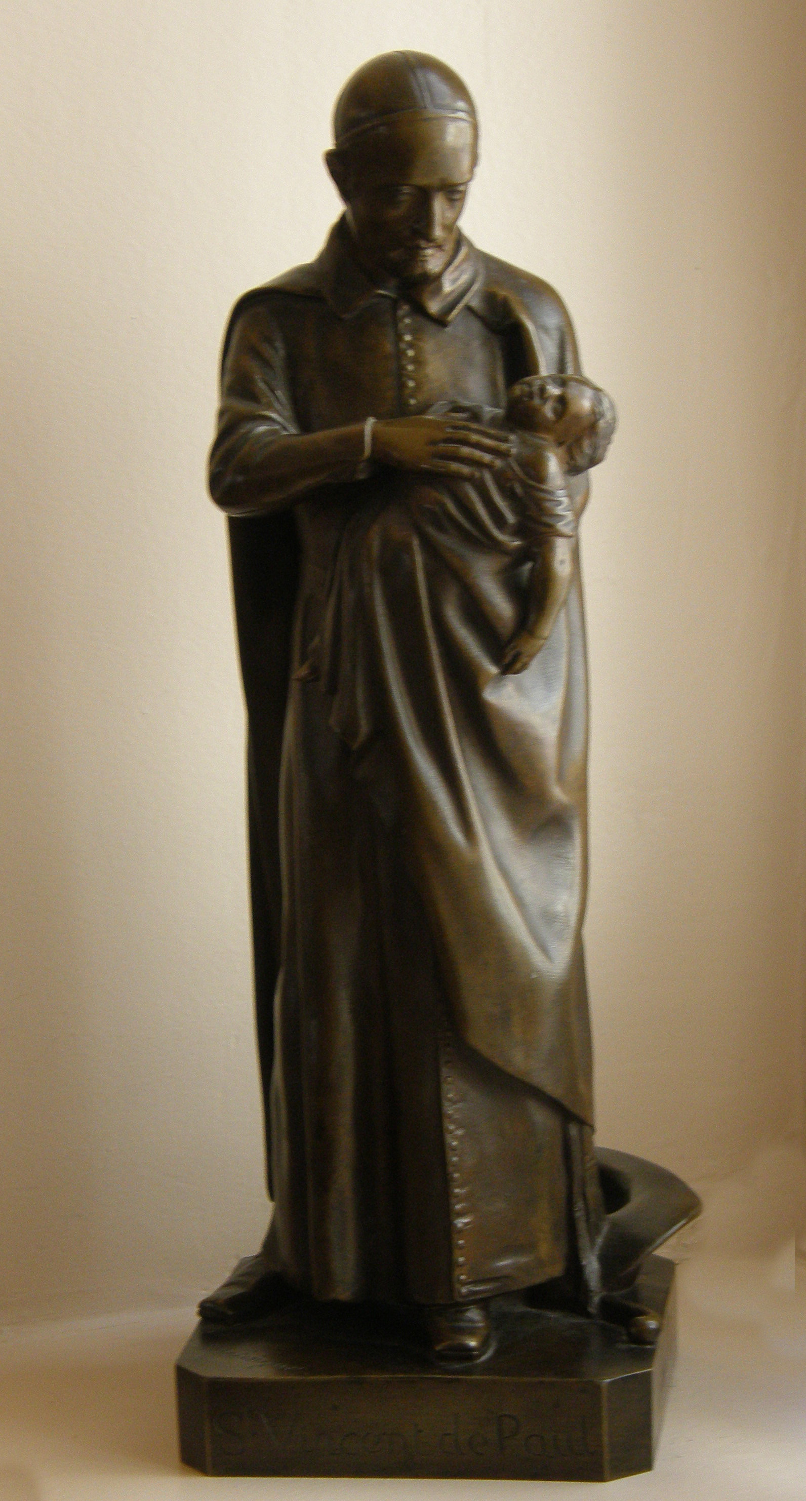 Bronze statue, Vincent de Paul, standing, cassock, cape, skullcap, hat and walking stick at his feet, holding sleeping child; original in Daughters of Charity house, rue deu Doyenné, Lyons