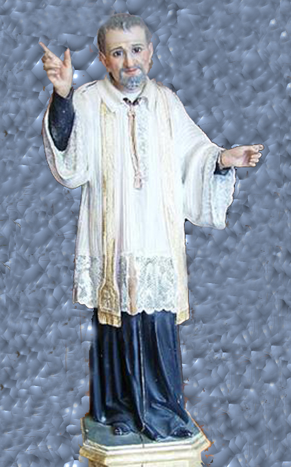 Painted plaster; Vincent de Paul, standing, cassock, surplice, gold stole; gesturing, and probably missing crucifix in left hand; location of original unknown