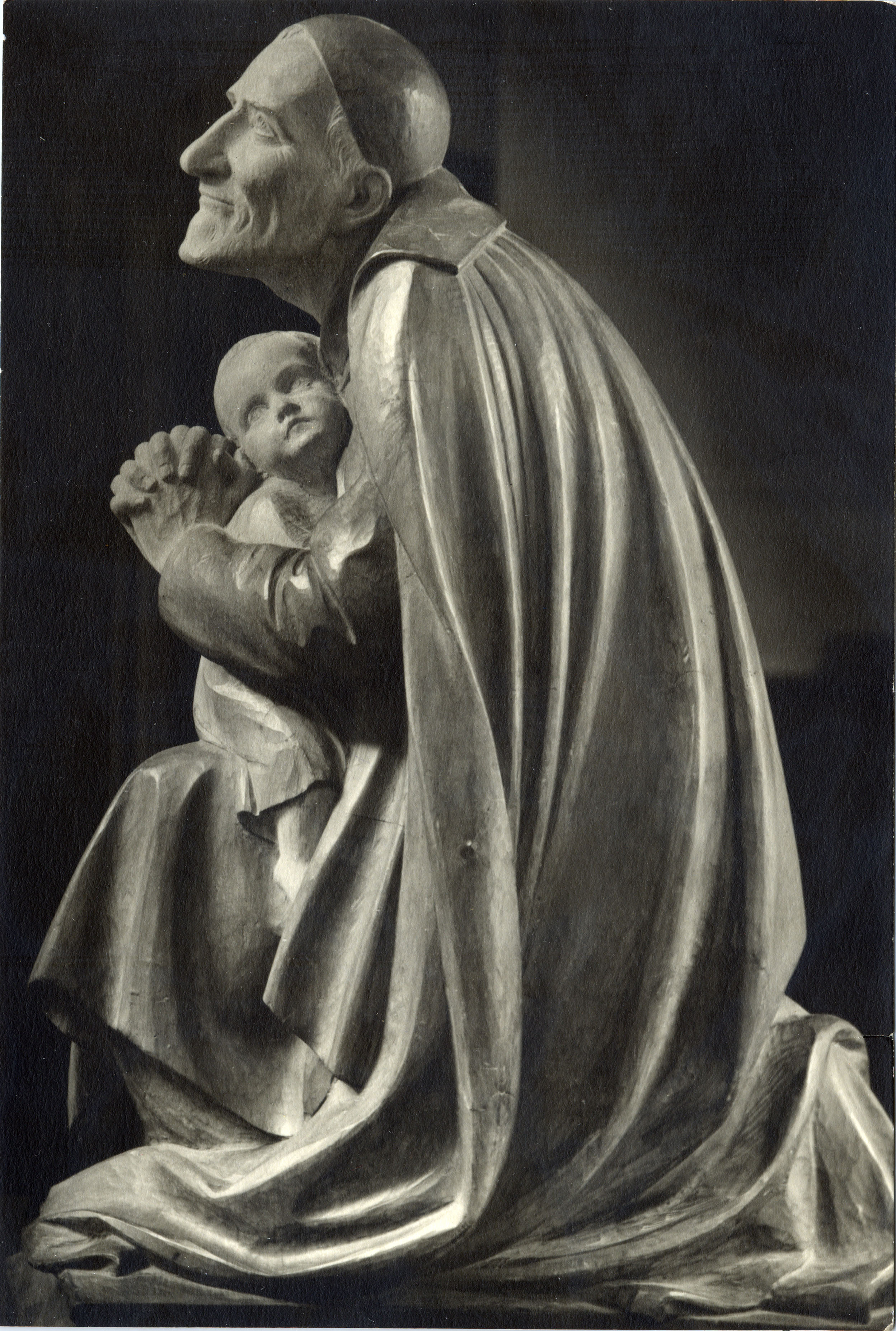 Carved wood; Vincent de Paul, kneeling, cassock, cape, skullcap, hands clasped in prayer; location of original unknown; photograph, 071, in Gunth collection, Paris