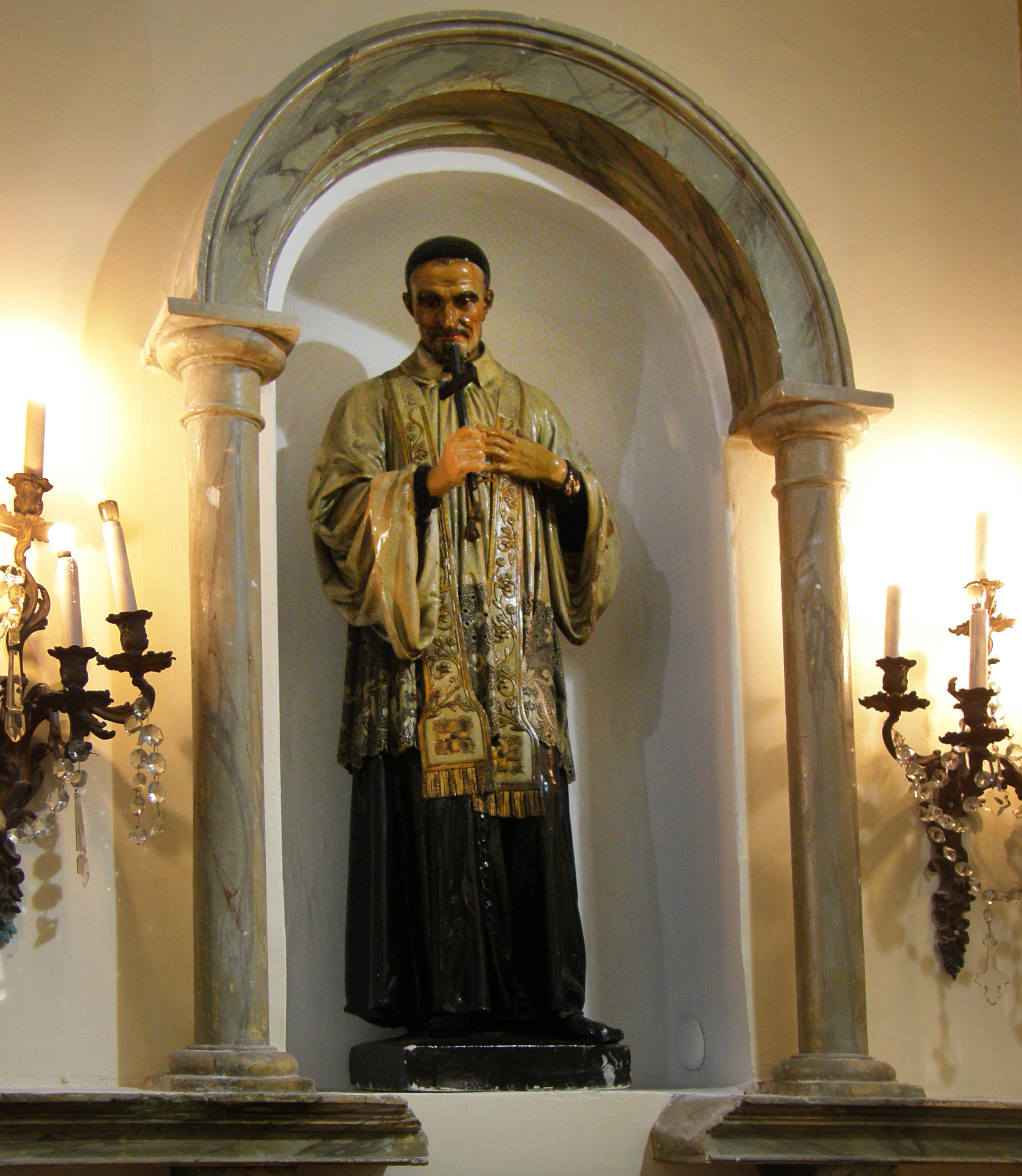 Vincent de Paul, standing, cassock, surplice, stole, skullcap, holding crucifix; in former Vincentian church, Bebek