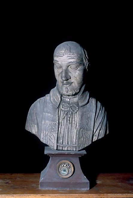 Wooden reliquary; Vincent de Paul bust, surplice, stole, no skullcap; internet image