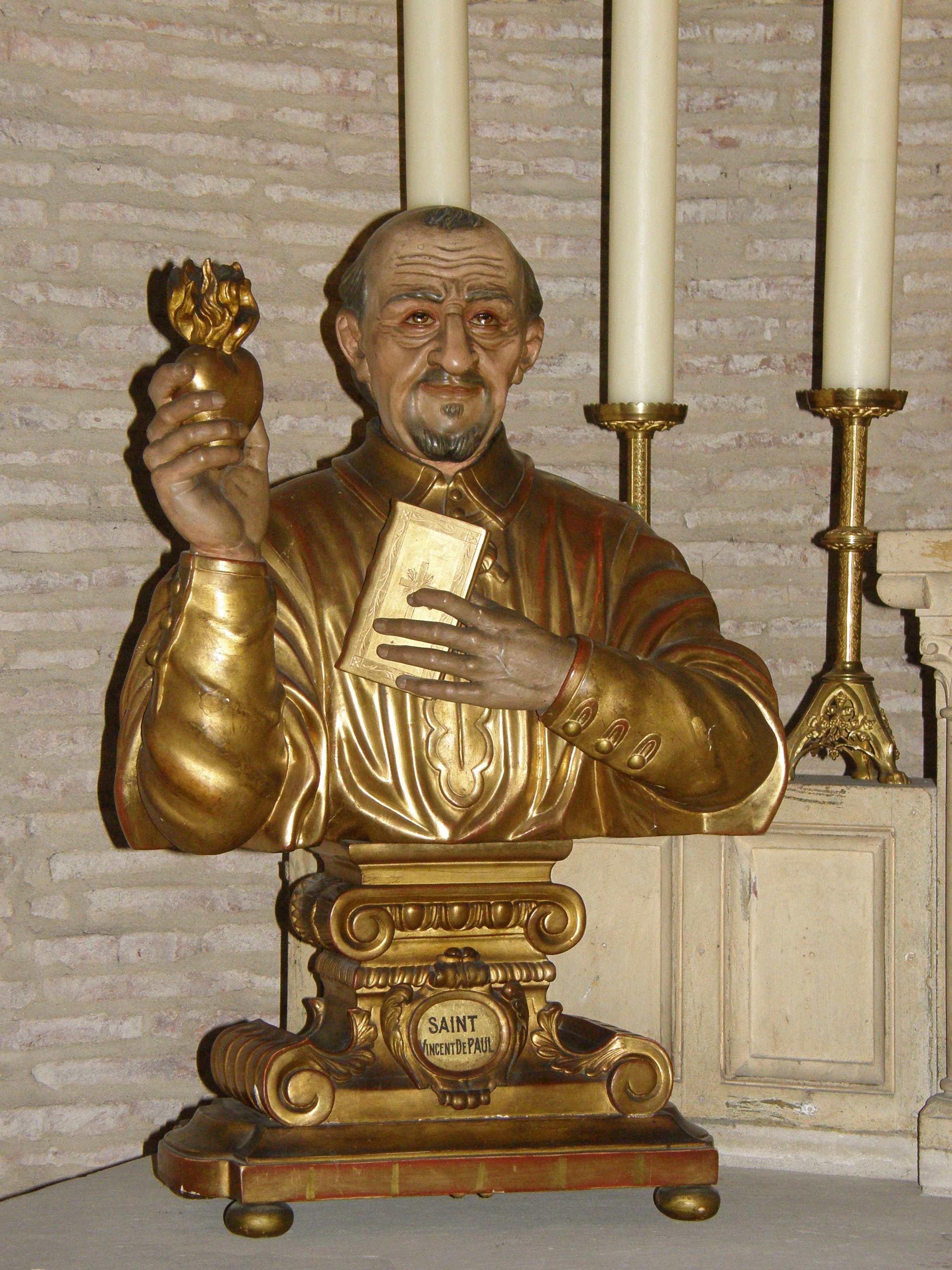Bust reliquary, Vincent de Paul holding book, heart of charity with flames; 18th century; in St. Sernin, Toulouse