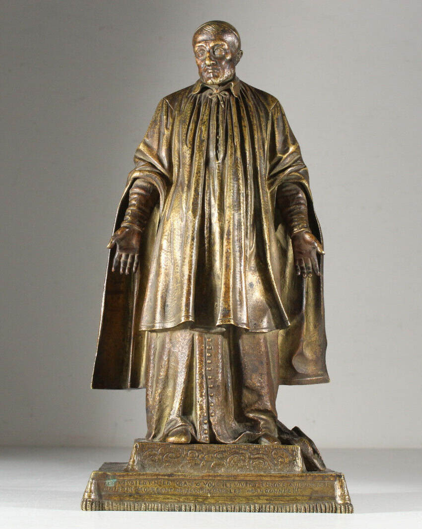 Ample Parisian surplice; hat at his feet; inscription on base
