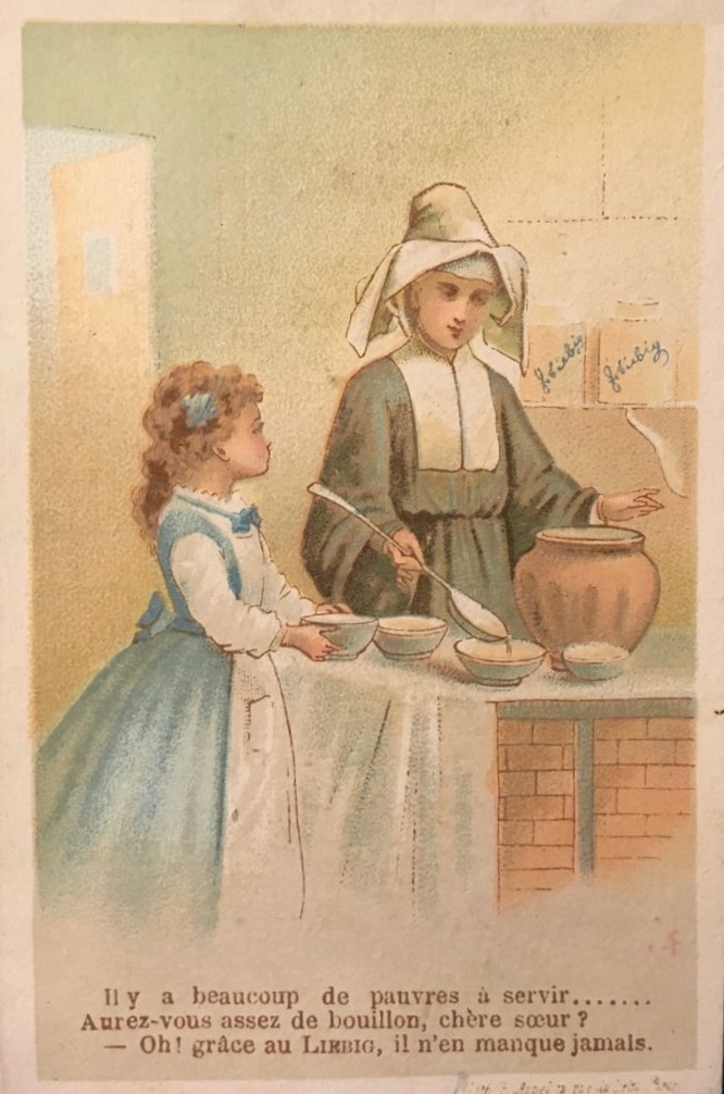 Text: There are many poor folks to serve. Will you have any soup, dear sister? Oh, thanks to Liebig, we will never be lacking.
