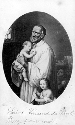 Oval detail from a larger image; writing: SVdP pray for me