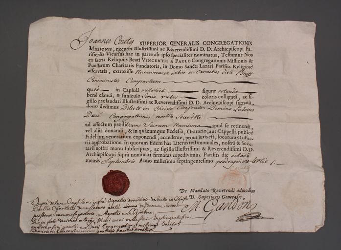 By Jean Couty, superior general; "coin" made from bones and the flesh of the saint;