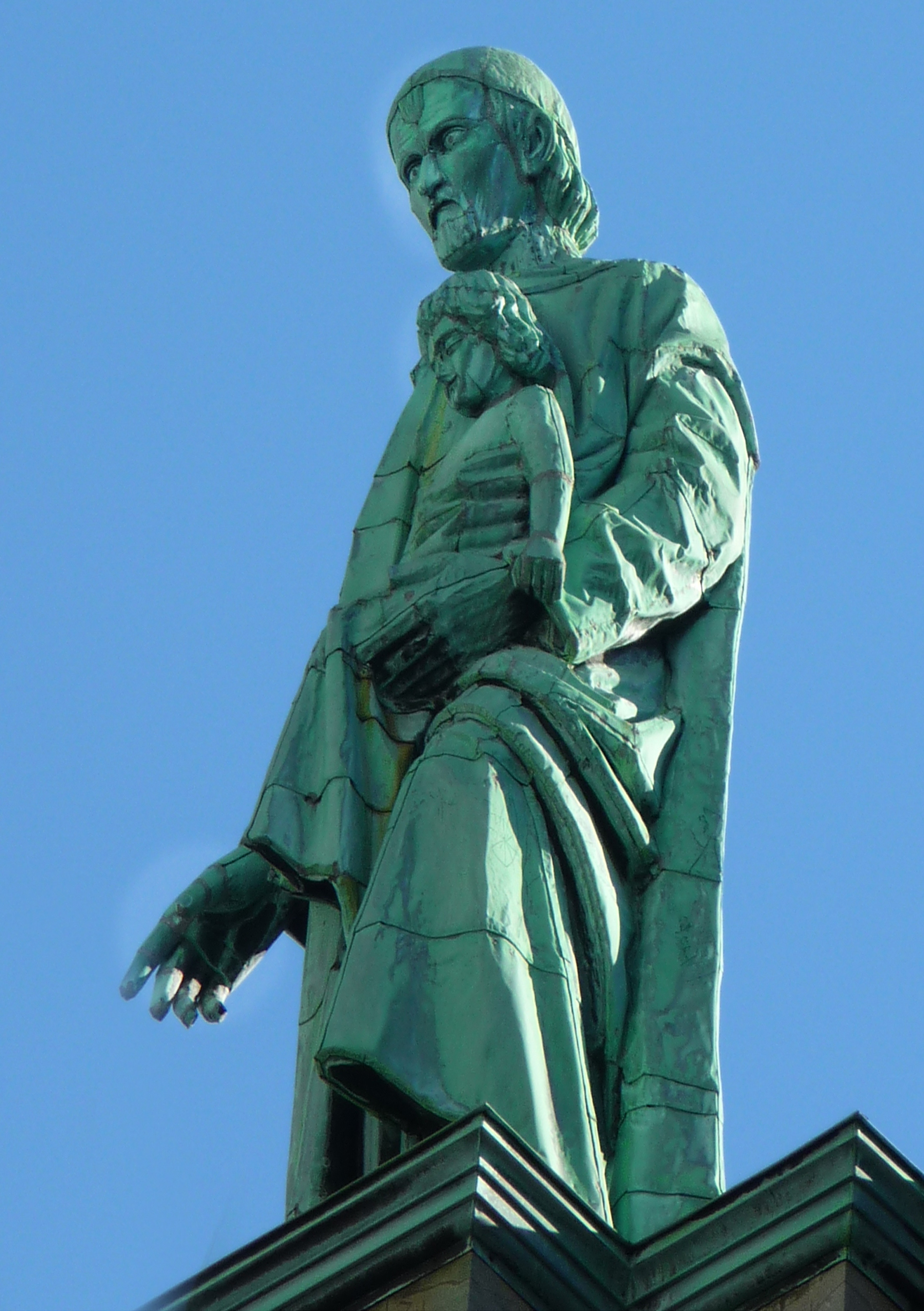 Bronze statue, Vincent de Paul, standing, cassock, mantle, skullcap, holding a child. Cathedral Basilica of Marie Reine du Monde. Courtesy of James H. Murphy, CM