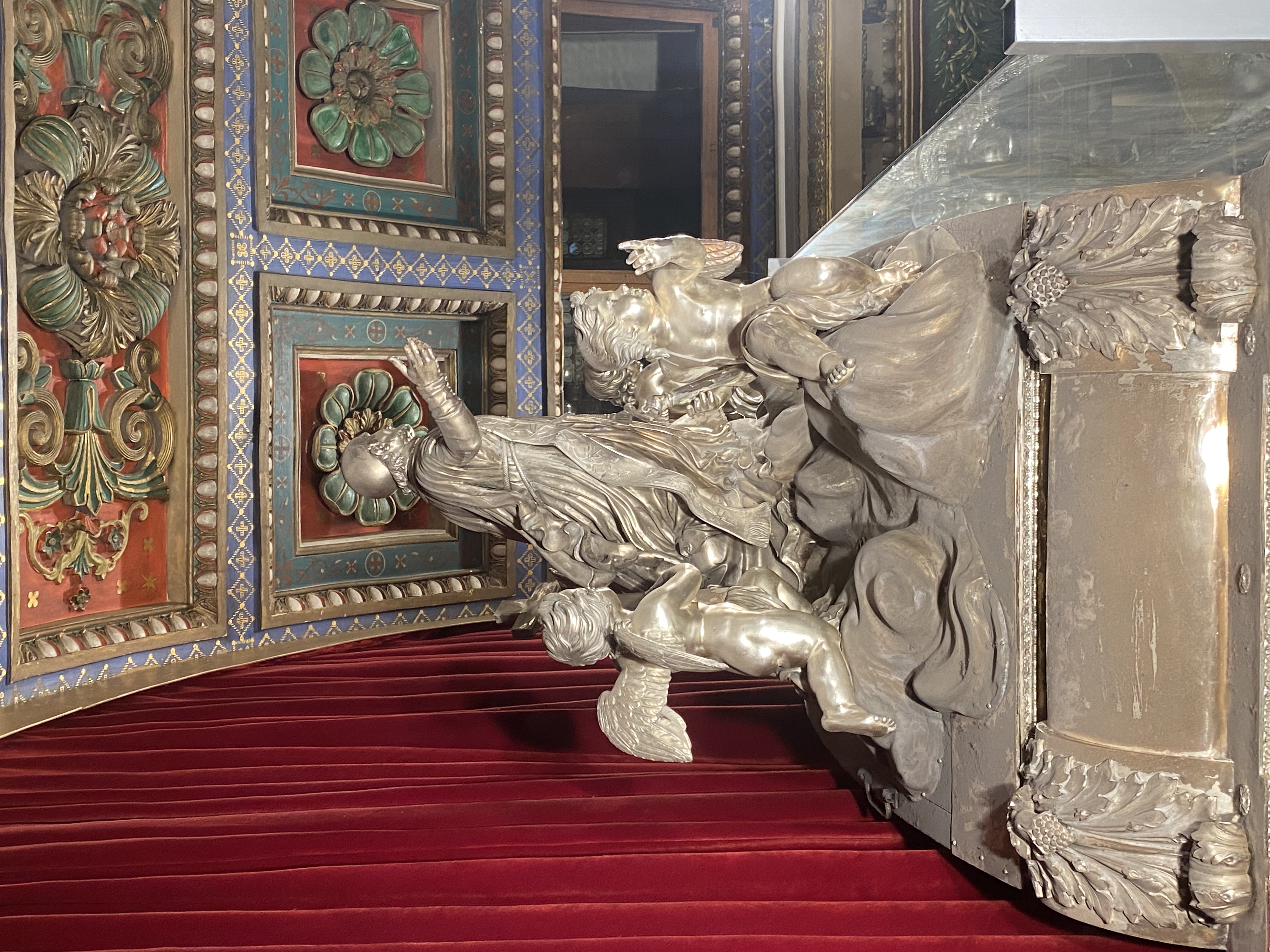 VdP, kneeling, with alb, stole held with cords; angels