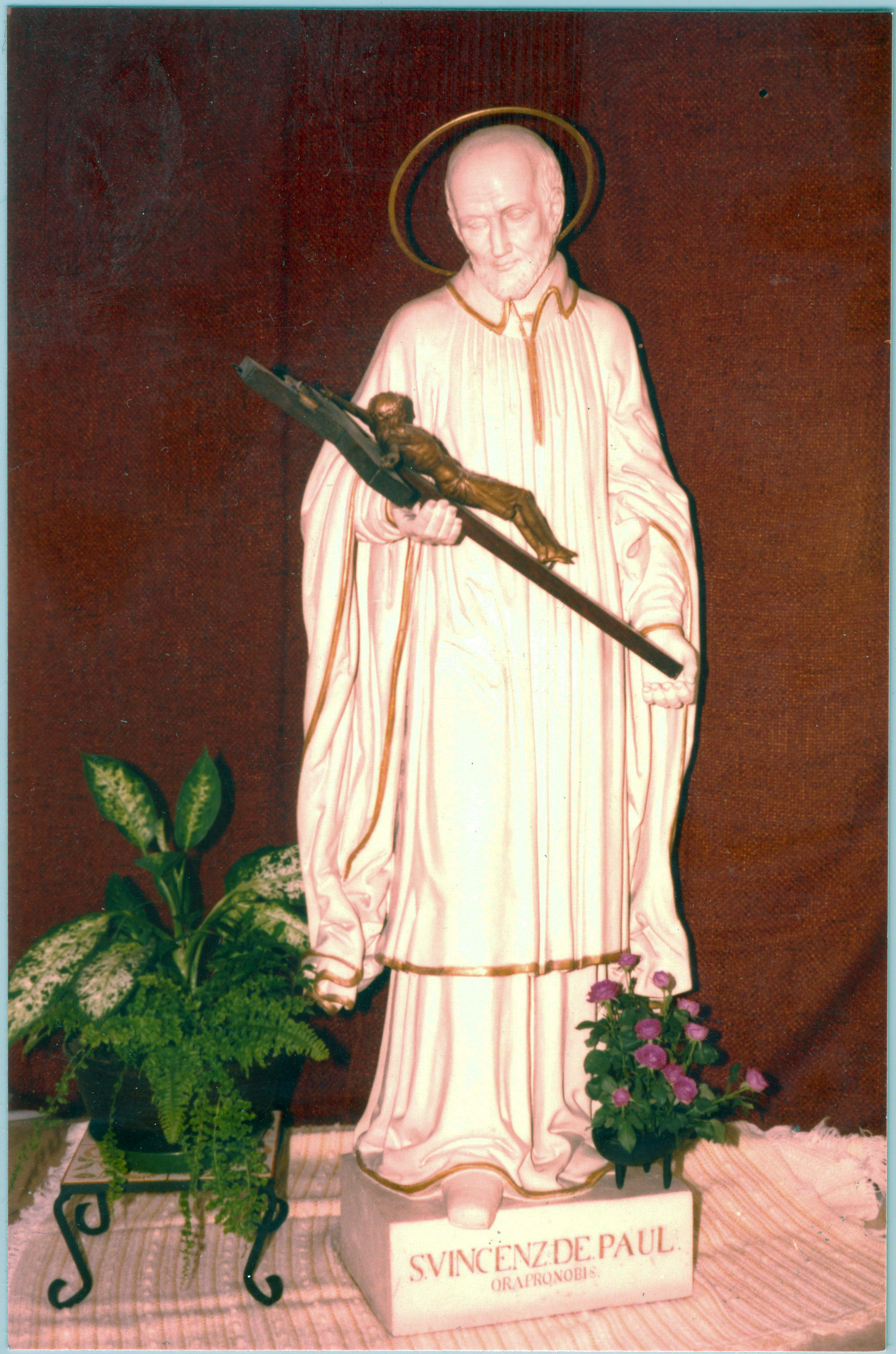 Vincent de Paul, standing, single color, with gold edges; completing added crucifix. May be Croatian title below. Photograph, unidentified, in Gunth collection, Paris