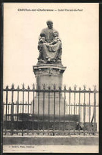 Text on base: Good people of Chatillon, where I will be, you will be present to me before God. (Attributed to VdP.)