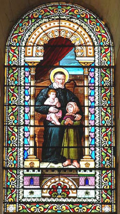 Vincent de Paul with two children, standing under archway. Original in church of St. Vincent de Xaintes, Dax.