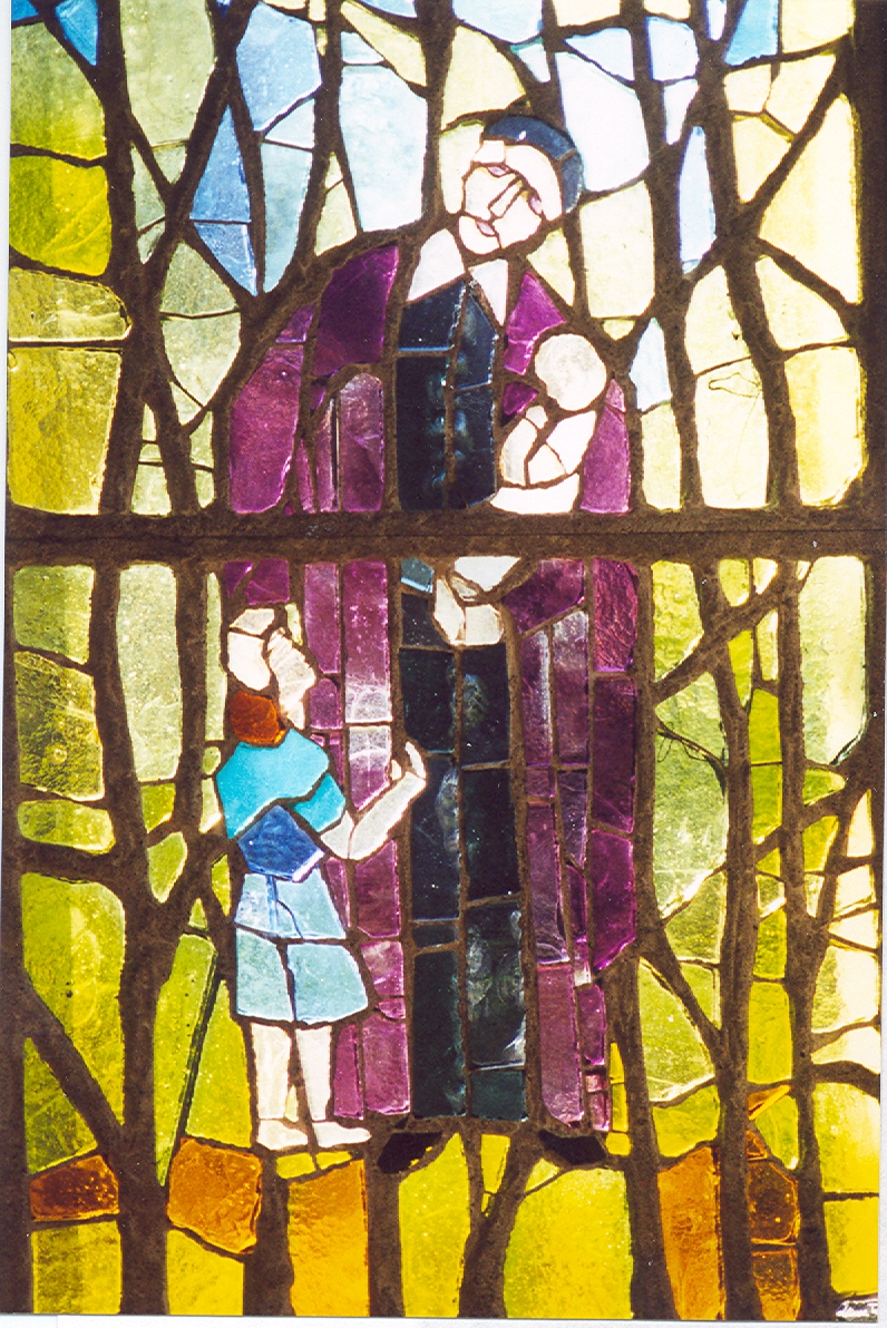 Vincent de Paul, two infants, faceted glass