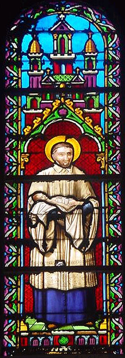 Vincent de Paul, in blue cassock, surplice, holds sleeping infant; loosely based on Falguières model. Original in parish church, Mâcon.
