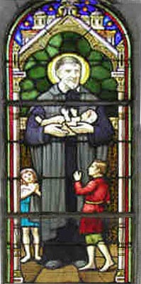 Vincent de Paul with three children; in cassock and grey sleeveless mantle; original in church of St. André, Val de Marne. (Internet image).