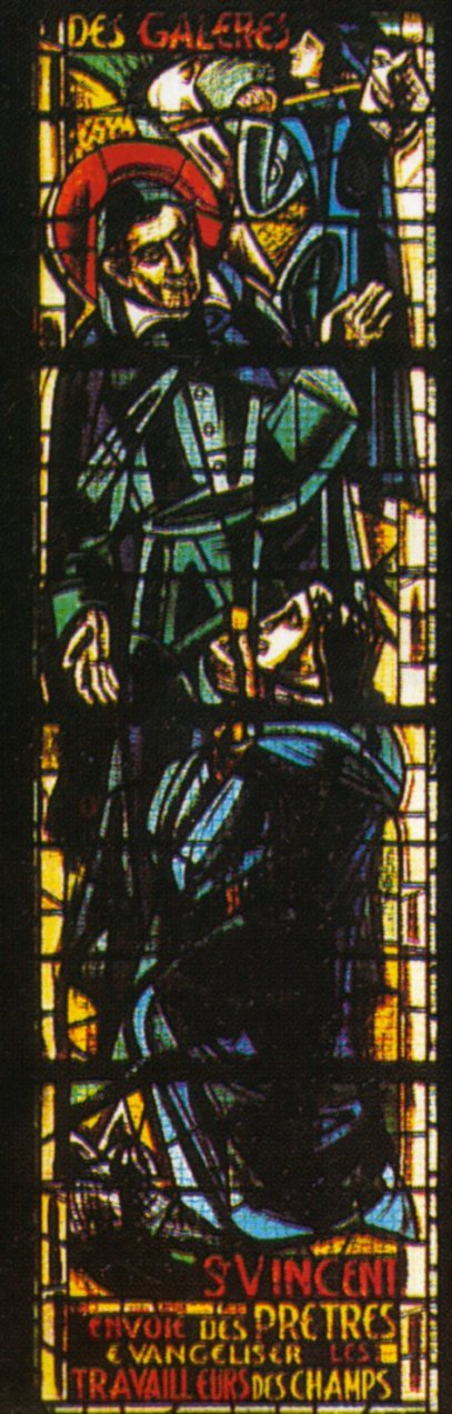 Vincent de Paul, kneeling figure; French text: "SV, treasure of priests, to evangelize field workers," above: "galleys." Location unknown