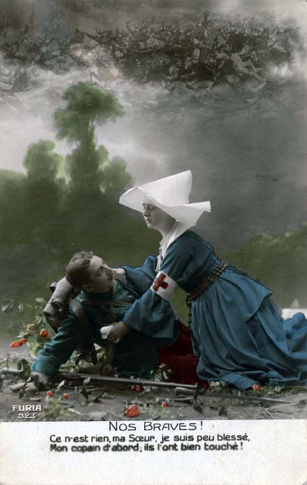 Text: Our brave men! It's nothing, Sister, I'm lightly wounded, but my buddy at first was really hit hard.