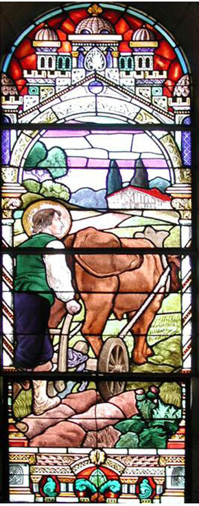 Vincent de Paul, young man, plowing with ox; family home, Ranquines, in background. Original in church, St-Vincent-de-Paul (Landes), formerly Pouy.