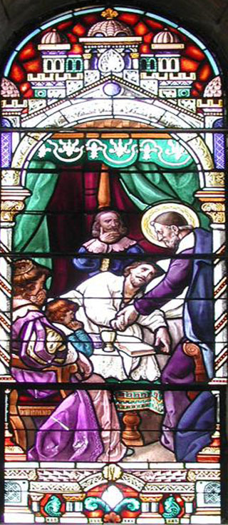 Vincent de Paul assists Louis XIII on deathbed; queen, Anne of Austria with young Louis XIV. Original in church, St-Vincent-de-Paul (Landes), formerly Pouy.
