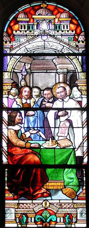 Symbolic view of Vincent de Paul proposing plan for a church to a notary; missioner and others in background. Original in church, St-Vincent-de-Paul (Landes), formerly Pouy.