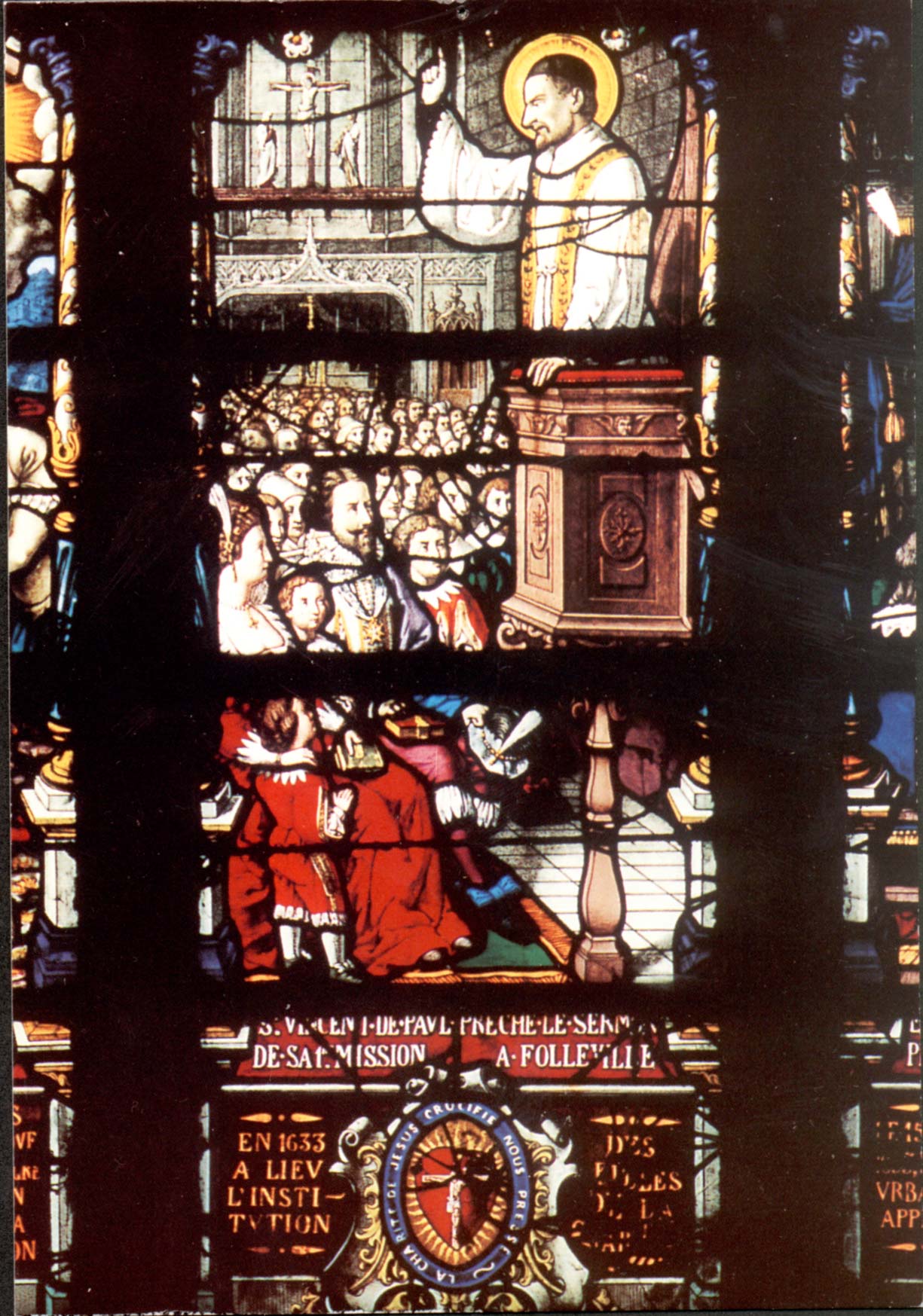Vincent de Paul preaching from pulpit in Folleville; Gondi family seated before him; church showing jubé (altar screen) behind; Daughters of Charity emblem and motto below with text concerning their foundation.