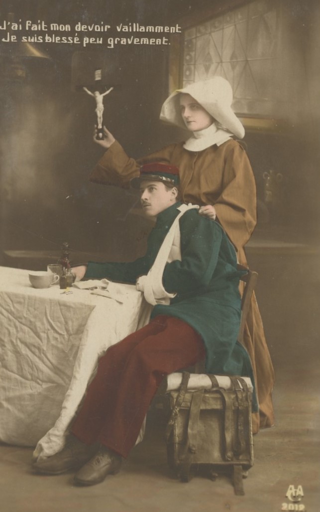 Text: I did my duty bravely. I was not gravely wounded. -- Sister in brown habit
