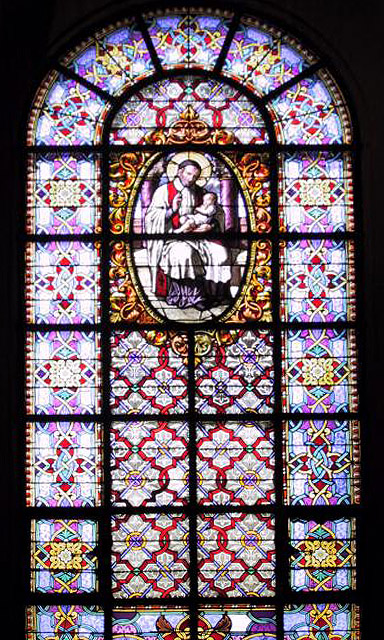 Vincent de Paul, seated, cassock, surplice, red stole, halo, holding child; based on Cabuchet model; original in St. Louis, Versailles