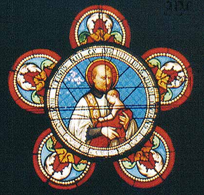 Vincent de Paul, cassock, surplice, stole, halo; holding child; in Peyrehorade parish; internet image Inscription illegible