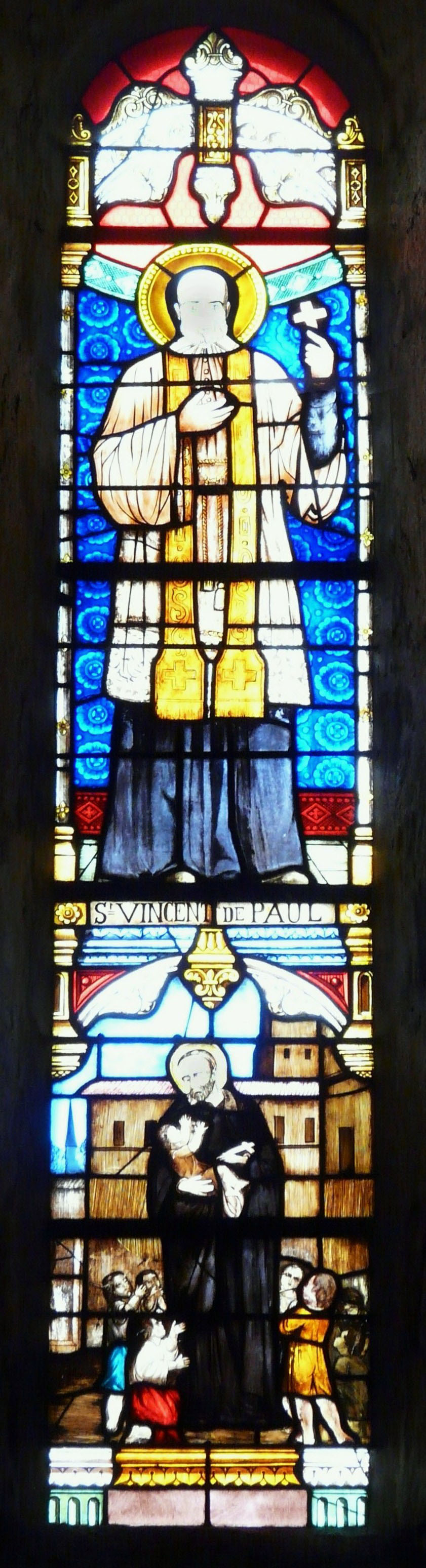 Vincent de Paul two scenes: as preacher with cross, helping children; in Saint-Maurice church, Montbron; by Pere Igor; internet image