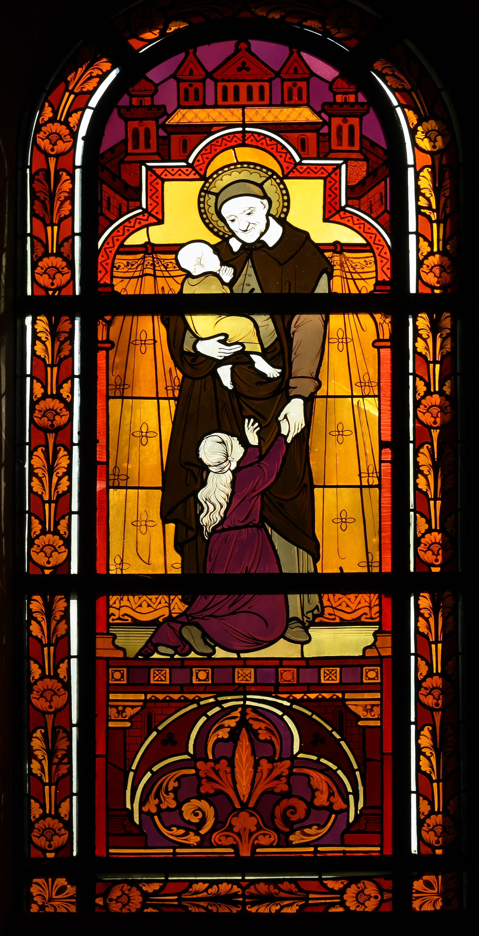 Vincent de Paul standing, cassock, mantle, skullcap, halo, with two children; by Reinhard Hauke; internet image