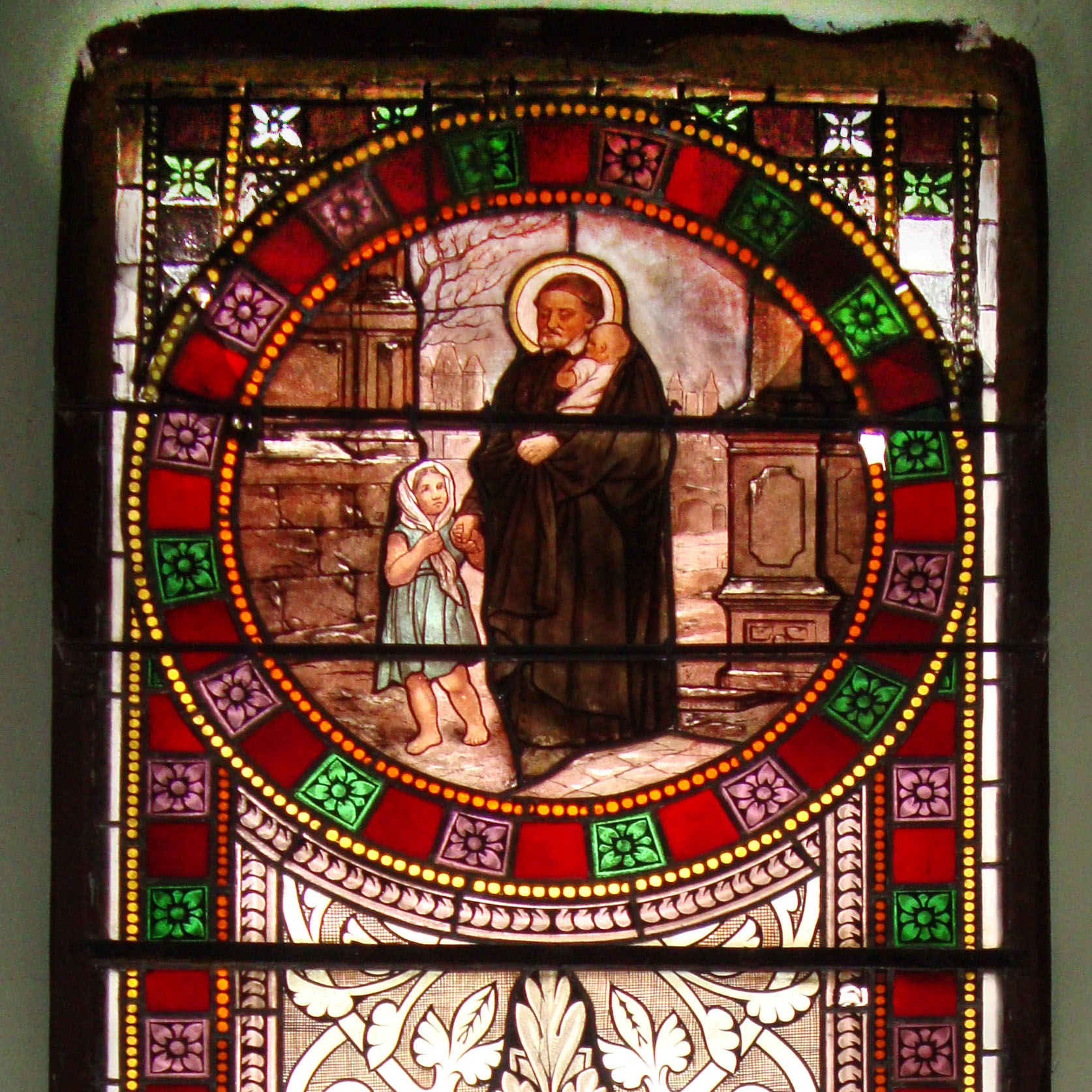 Vincent de Paul, standing, cassock, mantle, skullcap, halo, winter scene, with two children; in Osse-en-Aspe (Pyr-Atl); work of Augustin Montaut, 1887; by Havang, internet image