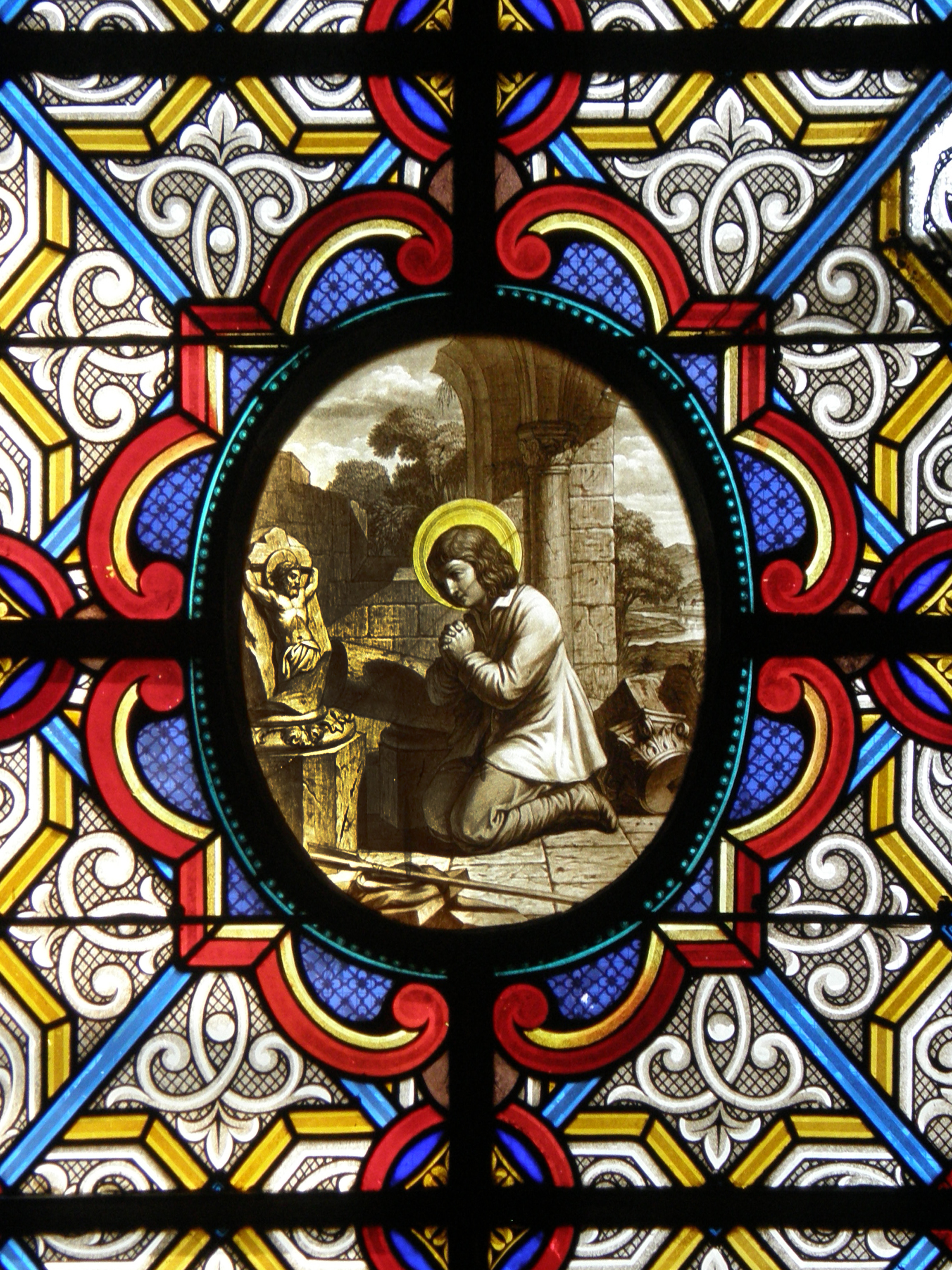 Not part of Paris series, replacing his being taken to heaven (Paris 22, shown in Berceau in an individual window); illustration specific to an event at the Berceau. Window by Laurent and Gsel, Paris (no date)