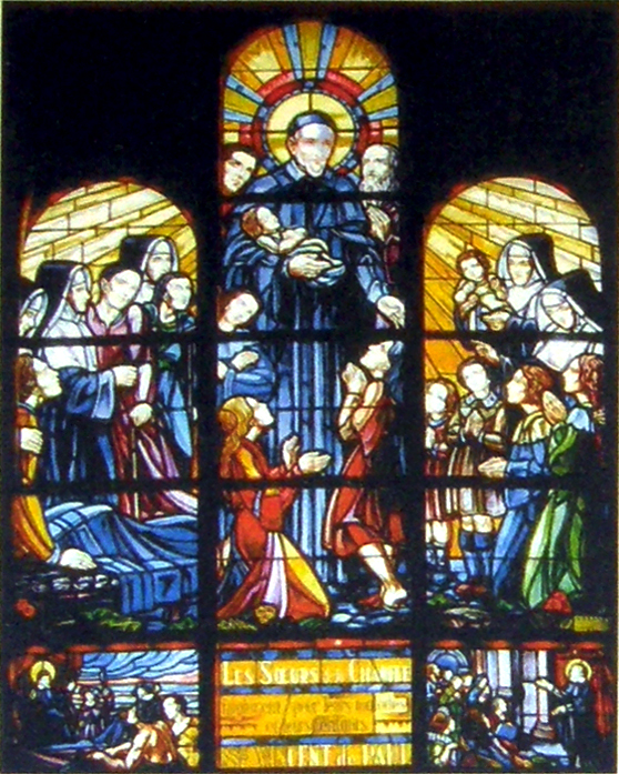 Vincent de Paul, standing, cassock, mantle, with children, Sisters, sick and poor; scenes from his life below: galleys, speaking; photograph of a photograph, courtesy of Daughters of Charity Archives, Paris