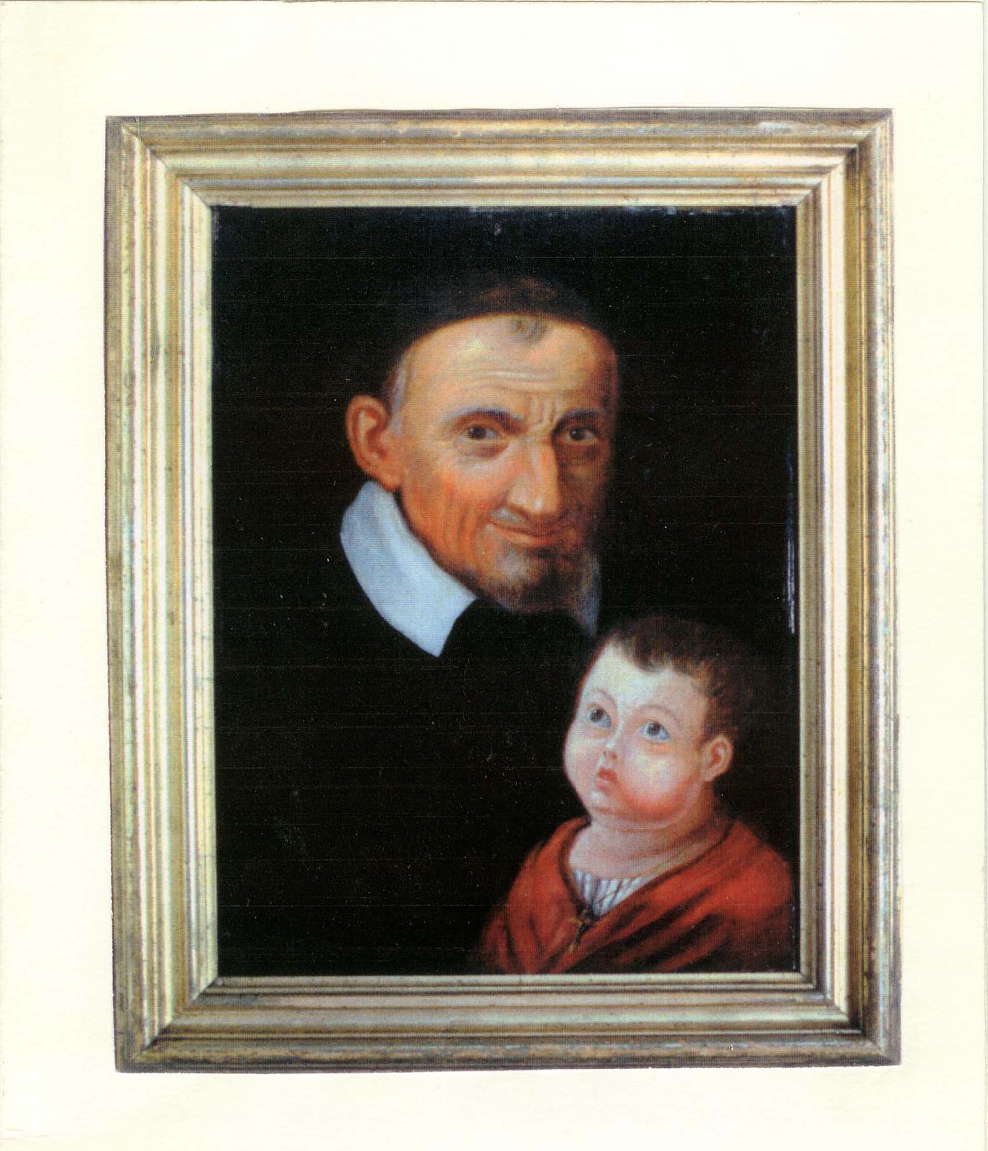 Framed oil painting; Vincent de Paul, child added later to portrait; may be 17th century; original in provincialate, Daughters of Charity, Mill Hill