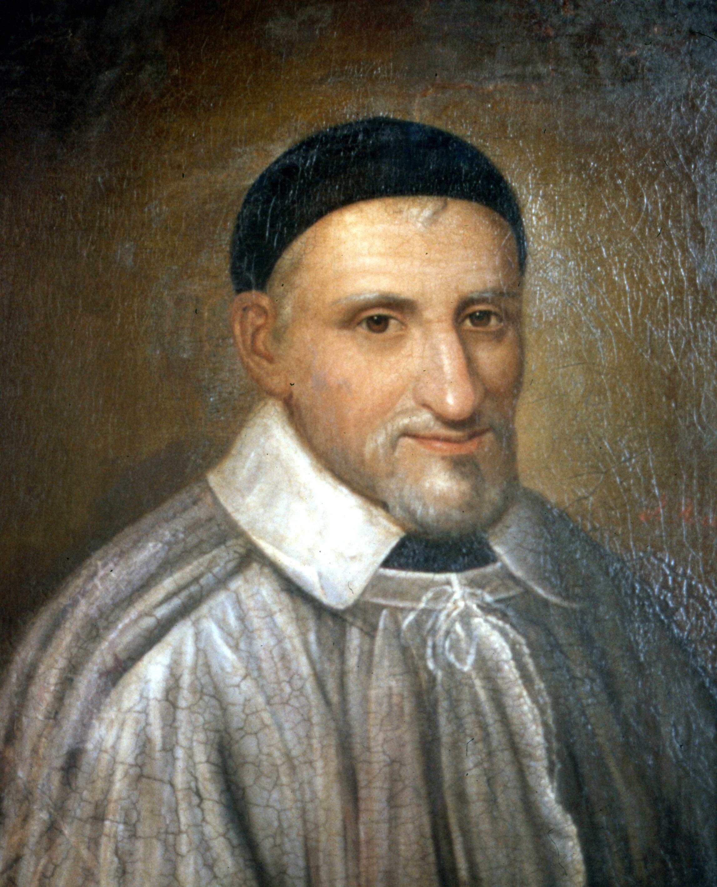 Oil painting, significant crackling; Vincent de Paul, surplice, copy of Moutiers St. Jean portrait; Original in office of economat, Vincentian mother house, Paris