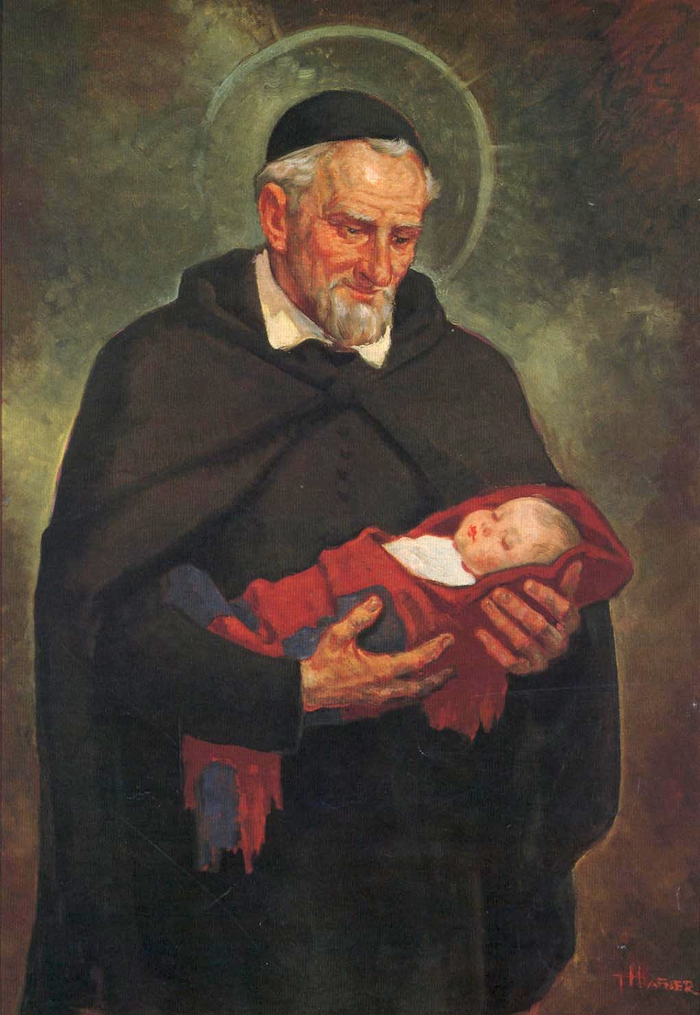 Oil on canvas; Vincent de Paul, standing, cassock, cape, skullcap, halo, holding sleeping infant in red and blue blanket; artist's name; location of original unknown