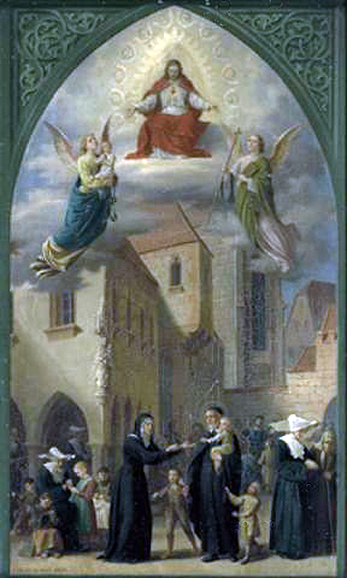 Vincent de Paul and Louise de Marillac gathering foundlings; Daughters of Charity with young and old; Jesus above with two angels, one with an infant; by Josef Gold, c. 1895; oil on wood; internet image after auction; location of original unknown