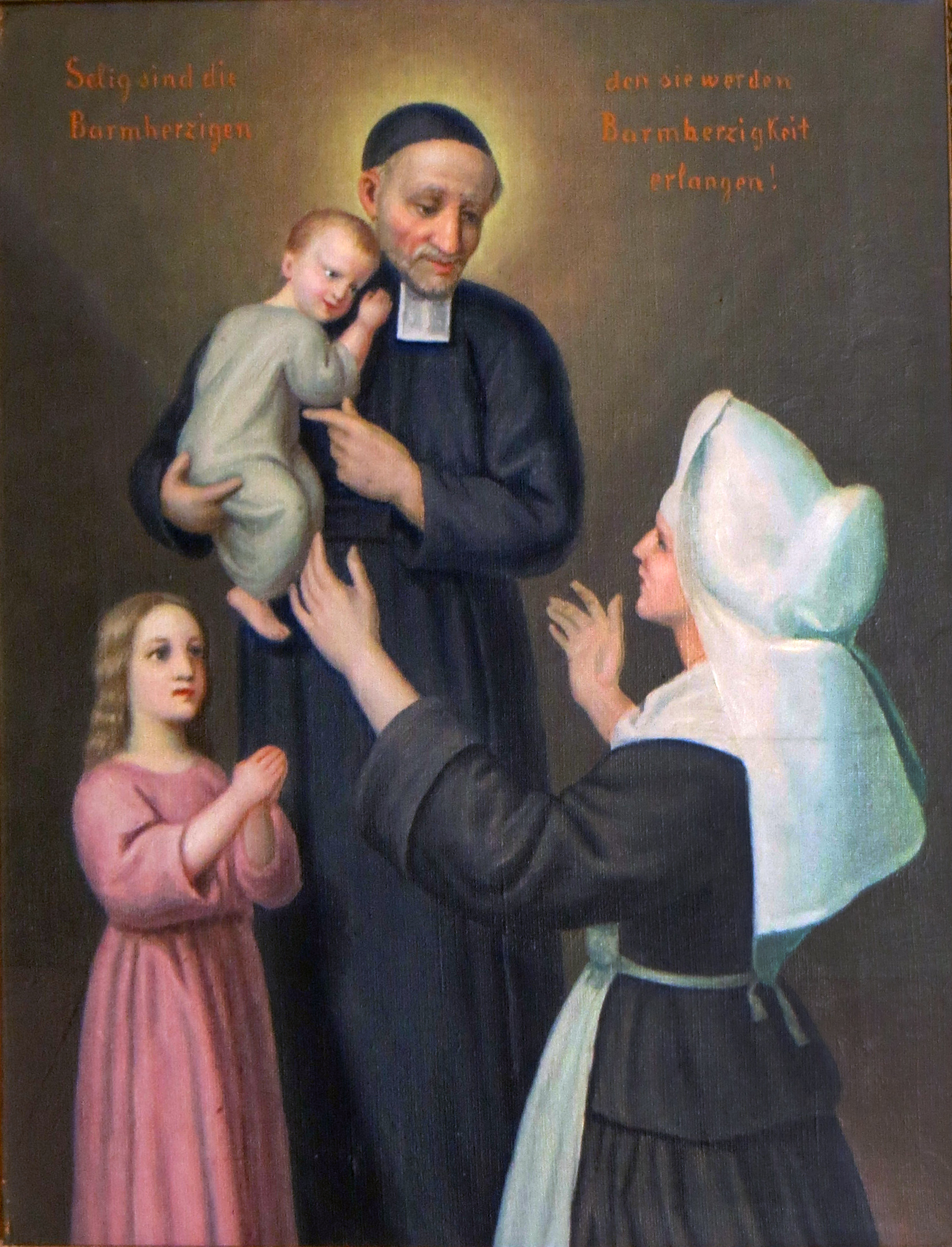 Text in German: Blessed are the merciful; they will receive mercyVdP with collar of diocesan clergy; Sister of Charity habit