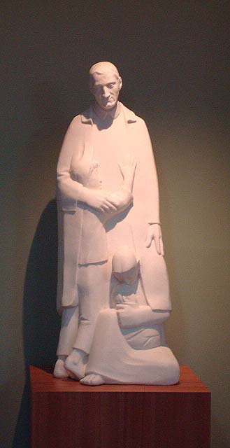 Carved stone statue, Vincent de Paul with figures of mother and infant, standing boy. Original in Germany. Internet image