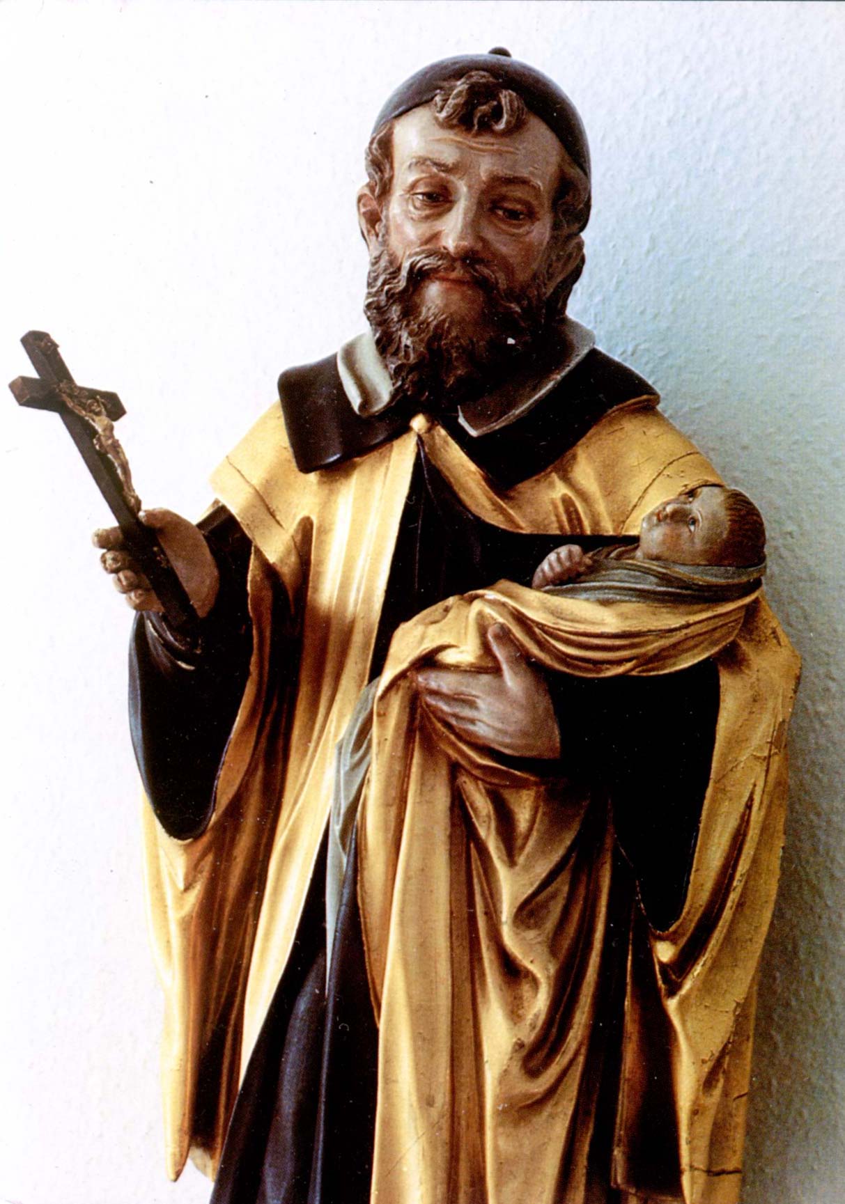 Carved wooden statue, gilded mantle; Vincent de Paul presenting crucifix before child in his arm; original in mother house of Sisters of Charity, Munich