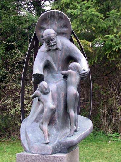 Vincent de Paul, seated, cassock, skullcap, metal halo; two children; outdoor statue, probably bronze; internet image; original in Indersdorf
