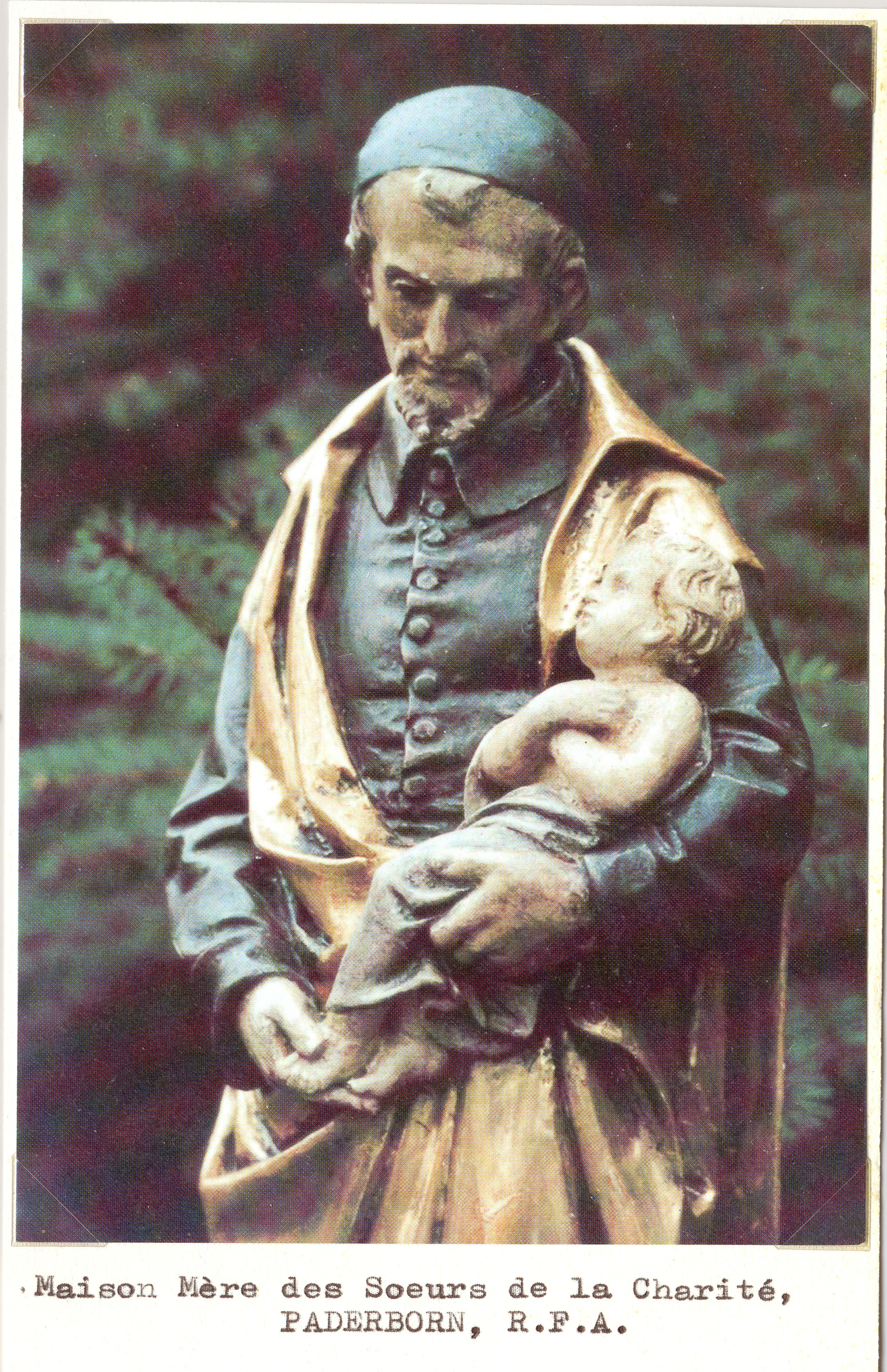 Painted statue; Vincent de Paul, standing, cassock with large buttons, cincture, mantle, skullcap; holding child; photograph in Gunth collection, 040, Paris