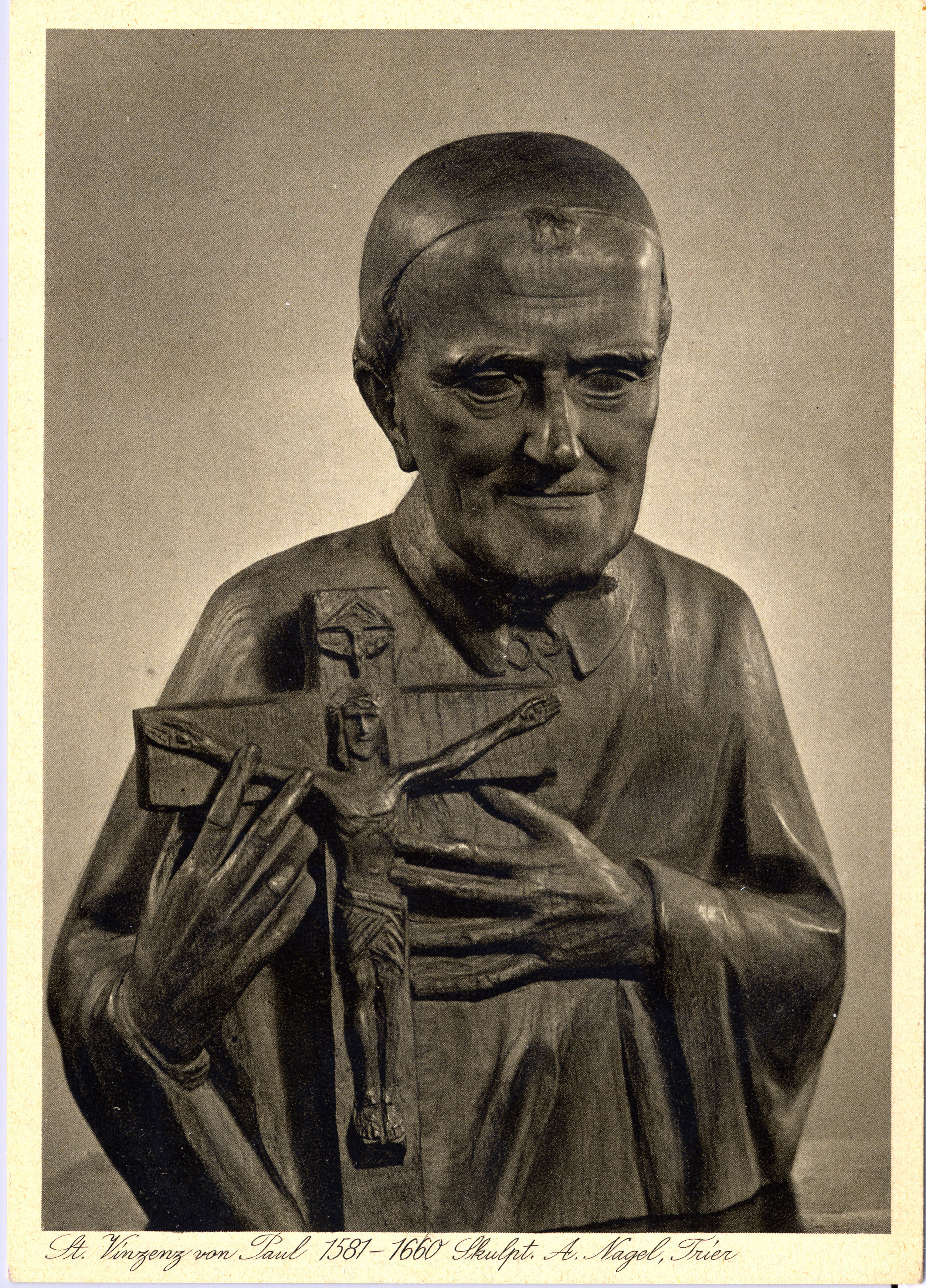 Carved wood bust, Vincent de Paul holding crucifix; work of Anton Nagel, Trier; photograph in Gunth collection, Paris, 056