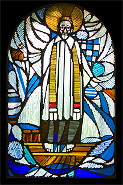 Vincent de Paul, cassock, surplice, stole, glasses, skullcap, halo, bare feet, holding loaf of bread; galley behind; original in Sisters of Charity, Heppenheiml; internet image