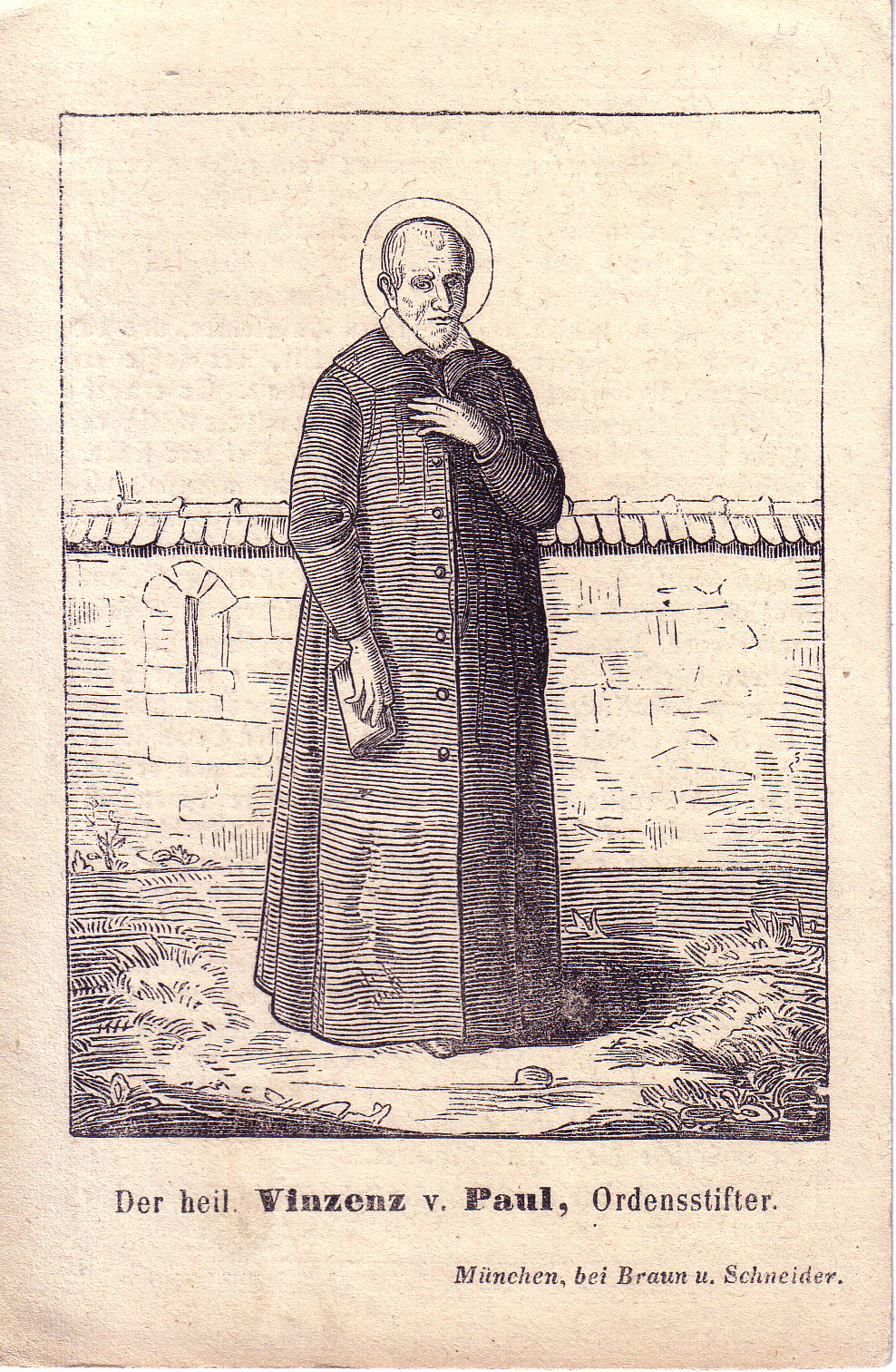 Vincent de Paul, standing, in cassock, full overcoat with buttons; holding book; text: St. Vincent de Paul, founder of a community; printed in Munich.